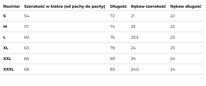 RozmiarSzerokość w klatce (od pachy do pachy)DługośćRękaw szerokośćRękaw długość