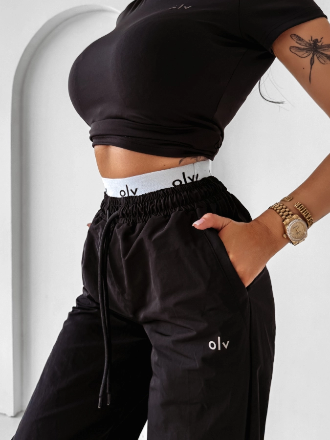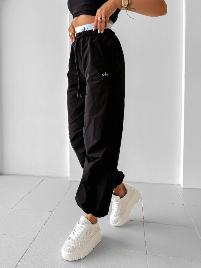 Model Rainy Day utrzymany jest w formie klasycznych spodni parachute, wyposażonych w dwie kieszenie boczne i dwie tylne, które nadają całości użytkowego, miejskiego stylu. Przy lewej kieszeni znajduje się subtelny napis OLV, będący rozpoznawalnym akcentem marki. Regulacja w pasie za pomocą sznurka pozwala na idealne dopasowanie do sylwetki, a regulowane ściągacze na brzegach nogawek umożliwiają noszenie spodni na różne sposoby - luźno lub bardziej dopasowane przy kostkach.