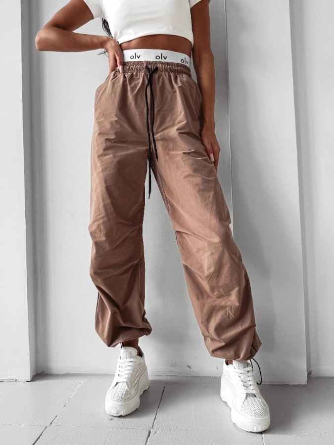Model Rainy Day utrzymany jest w formie klasycznych spodni parachute, wyposażonych w dwie kieszenie boczne i dwie tylne, które nadają całości użytkowego, miejskiego stylu. Przy lewej kieszeni znajduje się subtelny napis OLV, będący rozpoznawalnym akcentem marki. Regulacja w pasie za pomocą sznurka pozwala na idealne dopasowanie do sylwetki, a regulowane ściągacze na brzegach nogawek umożliwiają noszenie spodni na różne sposoby - luźno lub bardziej dopasowane przy kostkach.