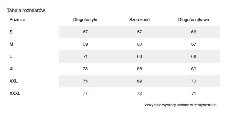 | Rozmiar | Szerokość pod pachami | Długość całkowita | Rękaw |
