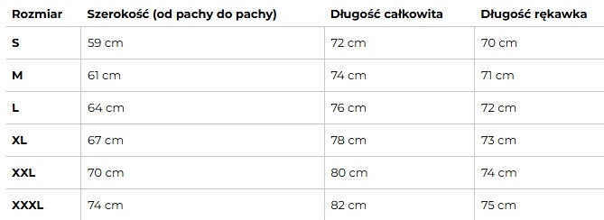 Rozmiar | Szerokość (od pachy do pachy) | Długość całkowita | Długość rękawka |