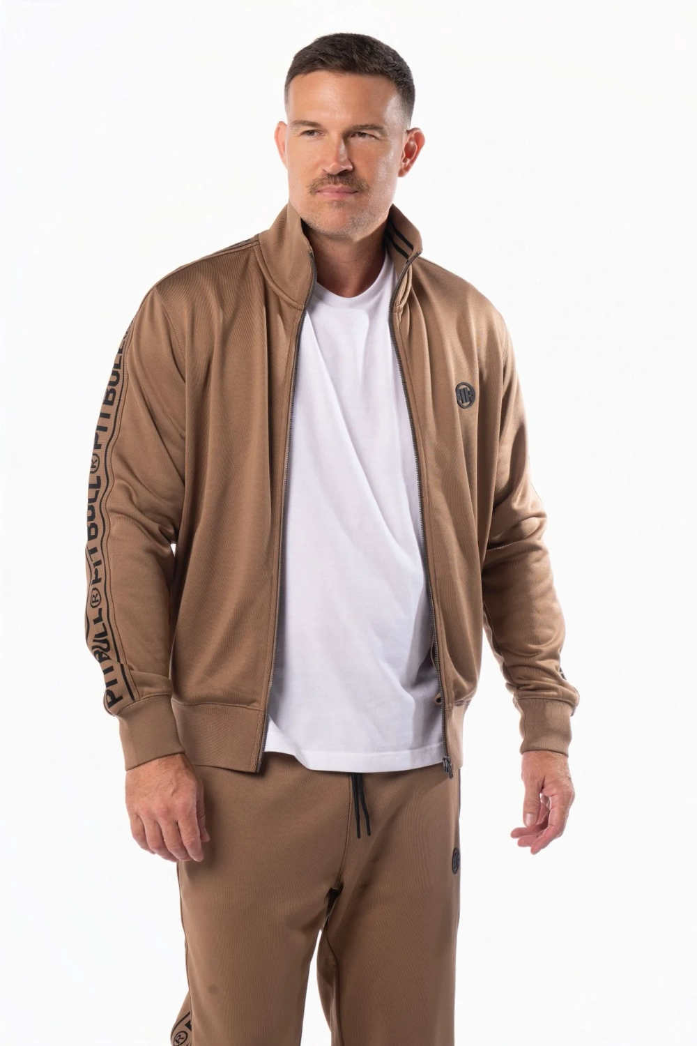 Komplet dresowy męski Pit Bull Tape Logo 25 w kolorze brązowym to propozycja łącząca wygodę z nowoczesnym, sportowym stylem. Wykonany w całości z wysokiej jakości poliestru, gwarantuje komfort noszenia, trwałość oraz swobodę ruchów.