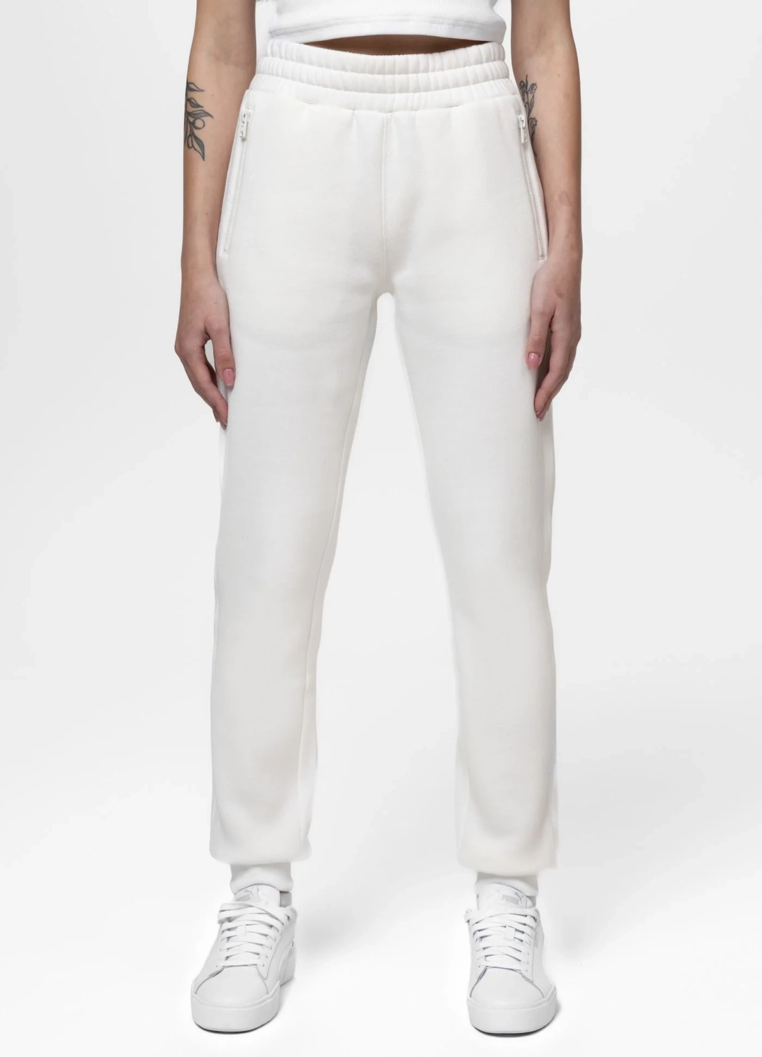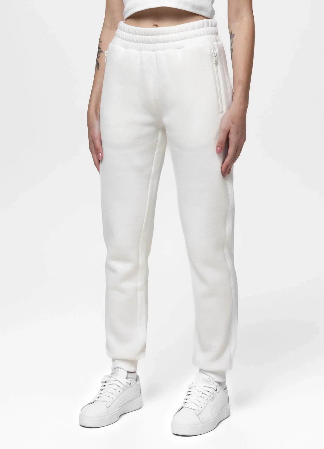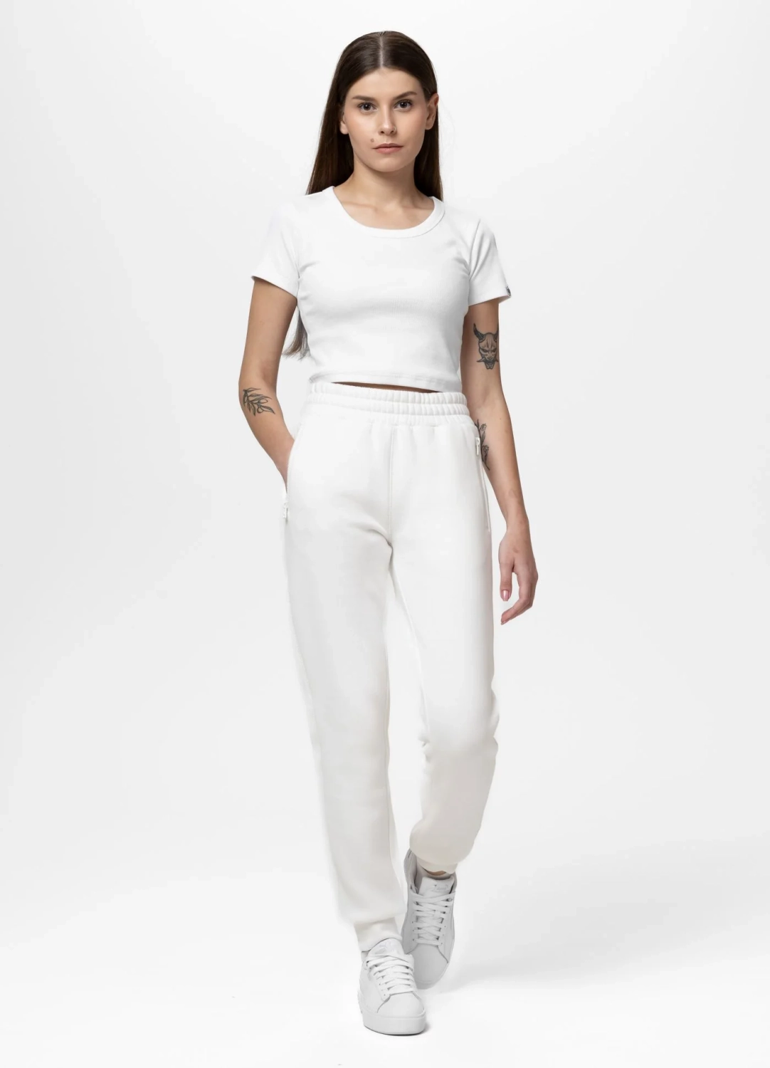 jako modny look miejski – biały komplet świetnie wygląda z sneakersami i lekką kurtką