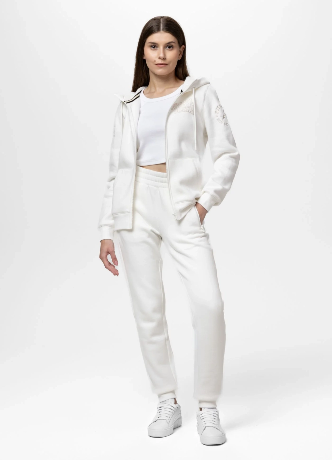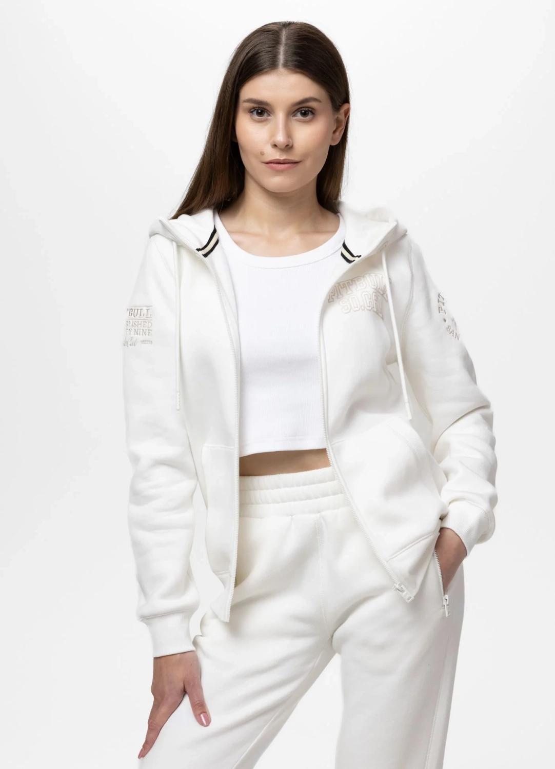 Biały komplet dresowy damski Pitbull Fiora – bluza z kapturem + spodnie. Wysoka jakość materiału, wygoda na co dzień i do treningu