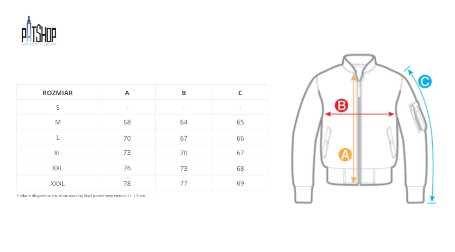 Sportowo-casualowy fason typu collage bomber, krótszy, sięgający do pasa
