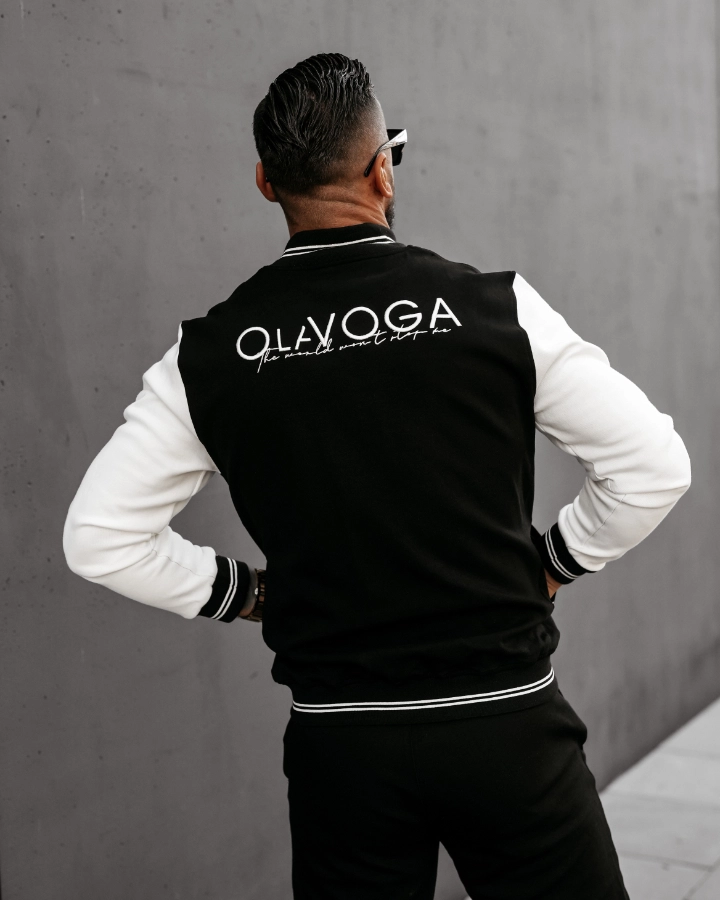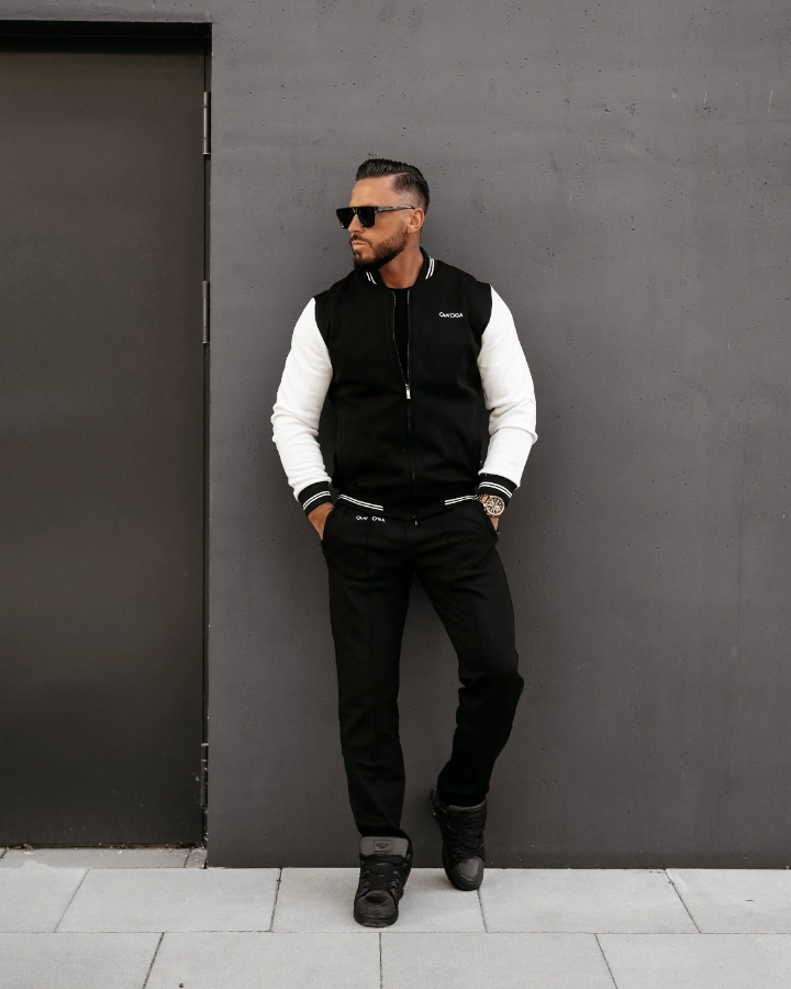 Sportowy komplet męski Raycuon w kolorze czarnym łączy funkcjonalność z nowoczesnym stylem. Góra to bluza typu bomberka z długim rękawem, zapinana na suwak, z kontrastowymi rękawami i elastycznymi ściągaczami w paski przy kołnierzu oraz mankietach. Subtelne logo OLAVOGA na piersi podkreśla minimalistyczny, modny charakter.