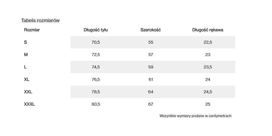 RozmiarSzerokość (od pachy do pachy)Długość całkowitaRękaw