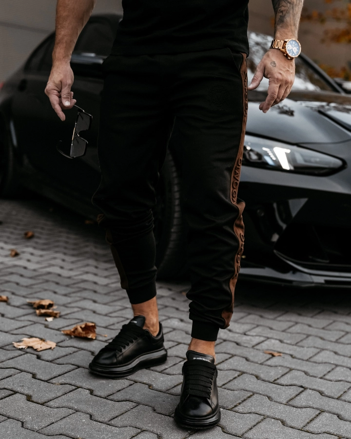 - Lampasy z tłoczonym logo wzdłuż nogawek