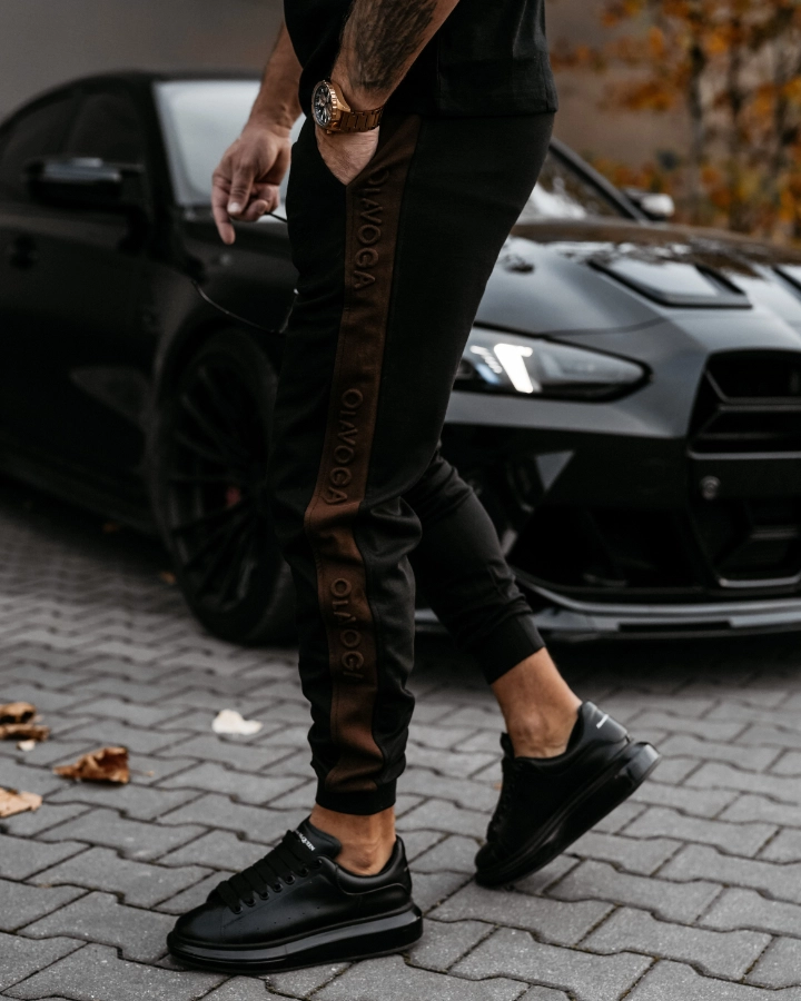 Model o zwężanym kroju i wysokim stanie został wyposażony w elastyczną gumę w pasie oraz regulowane troczki zakończone metalowymi końcówkami, które pozwalają idealnie dopasować spodnie do sylwetki. Boczne lampasy w kontrastowym kolorze z tłoczonym logo OLAVOGA nadają im wyrazistego charakteru, a haftowane logo z przodu podkreśla markowy design. Z tyłu umieszczono praktyczną kieszeń ozdobioną złotą, logowaną blaszką - subtelny detal, który dodaje całości stylowego wykończenia.