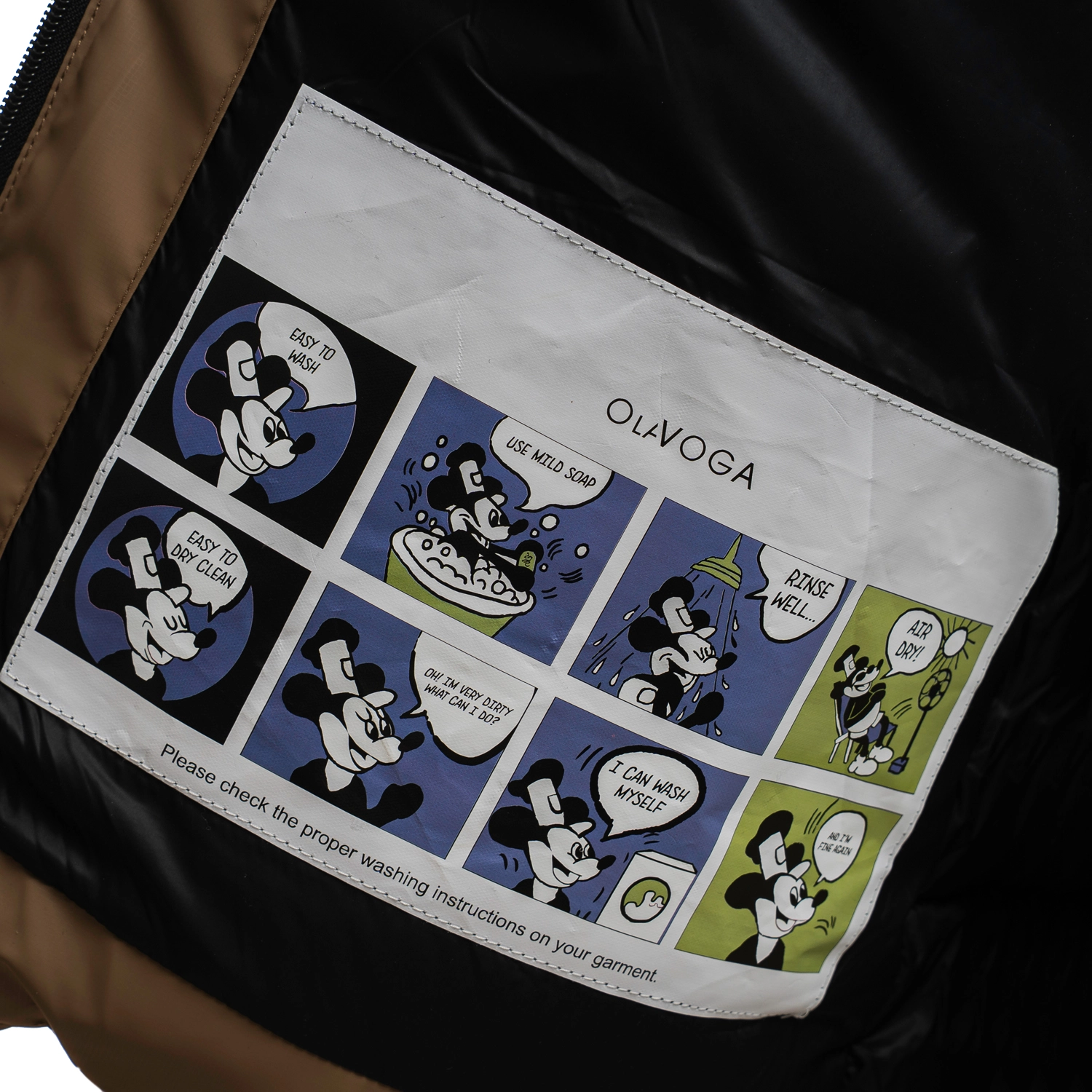 Model wyróżnia się minimalistycznym, casualowym krojem, który doskonale wpisuje się w aktualne trendy. Duży kaptur ozdobiony logotypem marki OLAVOGA stanowi mocny akcent wizualny, a boczne kieszenie na suwak dodają praktyczności. Na rękawie znajduje się matowa naszywka OLV, podkreślająca markowy charakter kurtki. Dodatkowym detalem jest oryginalna naszywka wewnątrz w formie komiksu OLAVOGA, która nadaje projektowi wyjątkowego, designerskiego charakteru.