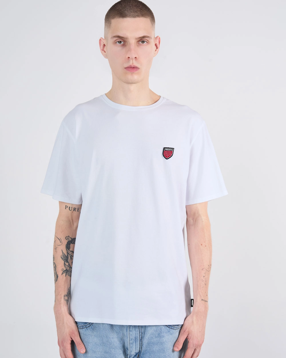 Męska koszulka Prosto Shield w kolorze białym to klasyczna propozycja w sportowo-miejskim stylu. Slimowany krój sprawia, że koszulka dobrze układa się na sylwetce i zapewnia wygodę w codziennym użytkowaniu. Żakardowa naszywka dodaje koszulce unikalnego charakteru, dzięki czemu doskonale wpisuje się w modę miejską, zachowując jednocześnie ponadczasowy charakter.