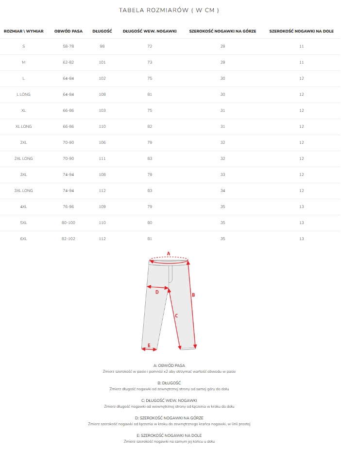 | Rozmiar | Szerokość w pasie | Nogawka zew./wew. | Udo | Dół nogawki |