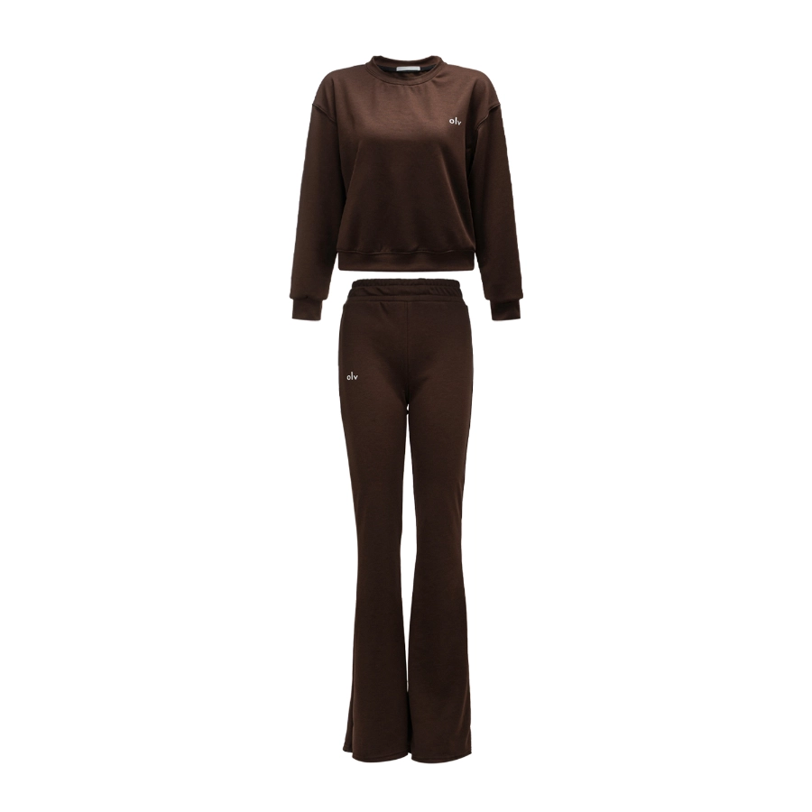 Dół kompletu to dopasowane spodnie z wysokim stanem, które pięknie podkreślają talię i wydłużają nogi. Rozszerzane ku dołowi nogawki nadają sylwetce lekkości i nowoczesnego wyrazu. Na przodzie znajduje się drobny akcent z logo olv, dopełniający spójną estetykę zestaw.