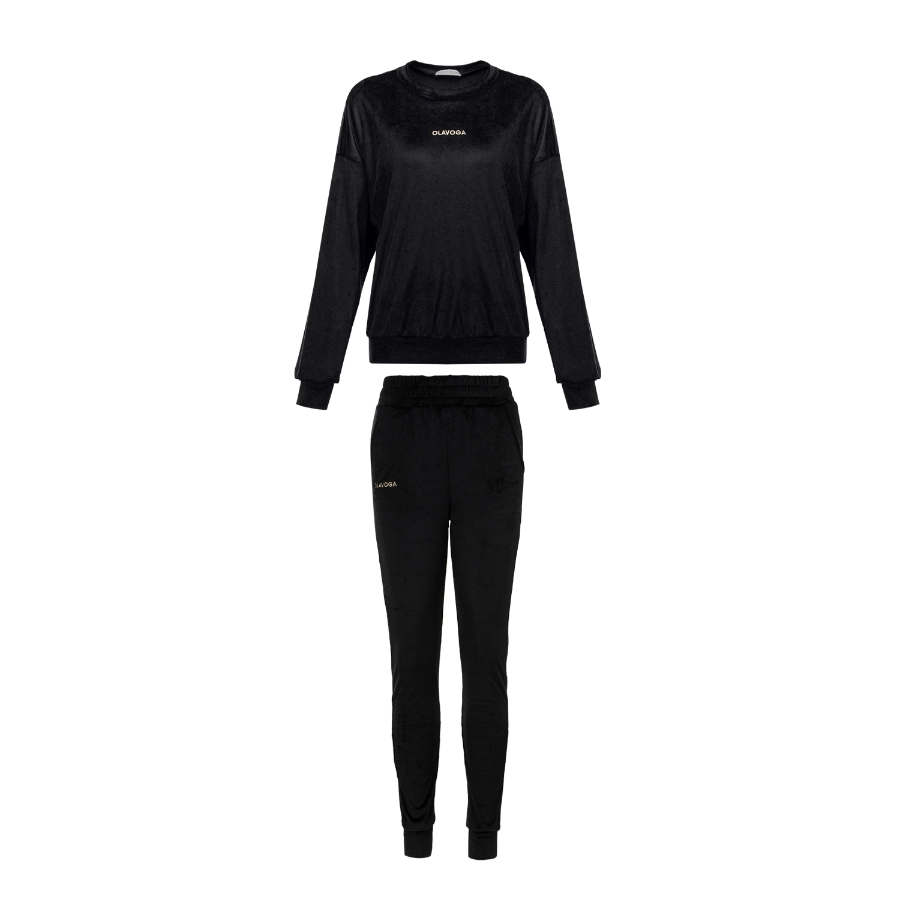 Welurowy komplet Velvet Aura w kolorze czarnym to propozycja dla osób, które cenią połączenie sportowego luzu, miękkiej tkaniny i eleganckich detali. Wykonany z przyjemnego w dotyku weluru, zapewnia wyjątkowy komfort i prezentuje się niezwykle stylowo, wpisując się w aktualne trendy athleisure. To idealny zestaw zarówno dla Niej, jak i dla Niego.