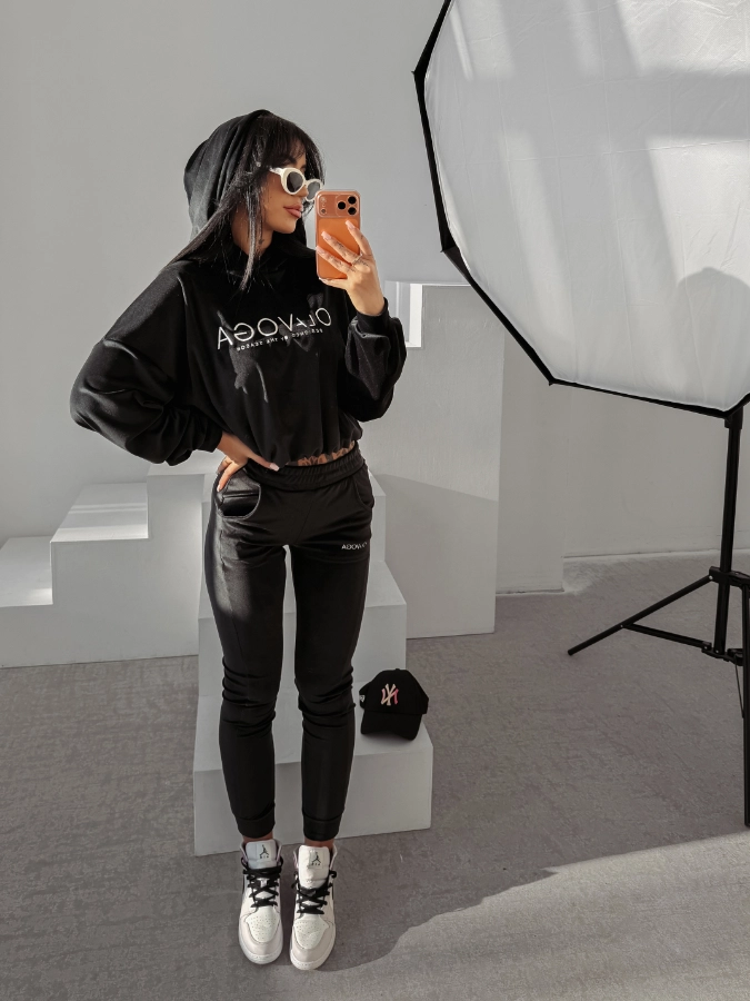 Dół zestawu to dopasowane spodnie z elastycznym pasem i praktycznymi kieszeniami, które zapewniają swobodę ruchów. Nogawki zakończone ściągaczami delikatnie modelują sylwetkę, a subtelny haft z logo OLAVOGA na nogawce dopełnia spójny, nowoczesny design.