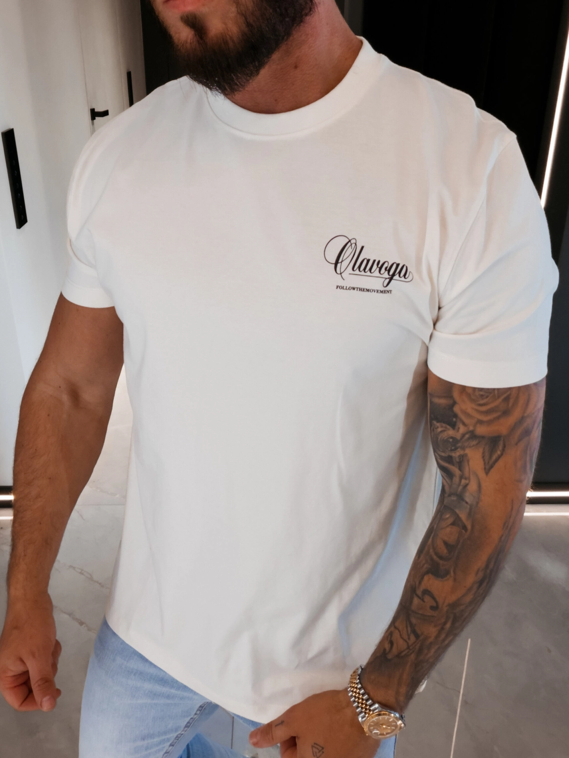 Na piersi znajduje się subtelne, minimalistyczne logo marki, natomiast na plecach umieszczono duży, efektowny print z logo Olavoga i napis "FOLLOW THE MOVEMENT", który nadaje koszulce wyrazistego charakteru.